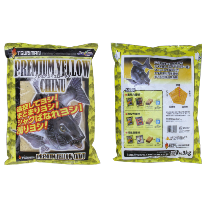 プレミアムイエローチヌ分類: tsuriman描述 描述遠投してヨシ! まとまりヨシ! シャクばなれヨシ! 濁りヨシ!広く拡散する黄色煙幕でチヌを寄せ、沈下するカラー麦・コーン・カキ殻などでチヌの喰い気を誘う!チヌ釣究極の集魚材約3kg